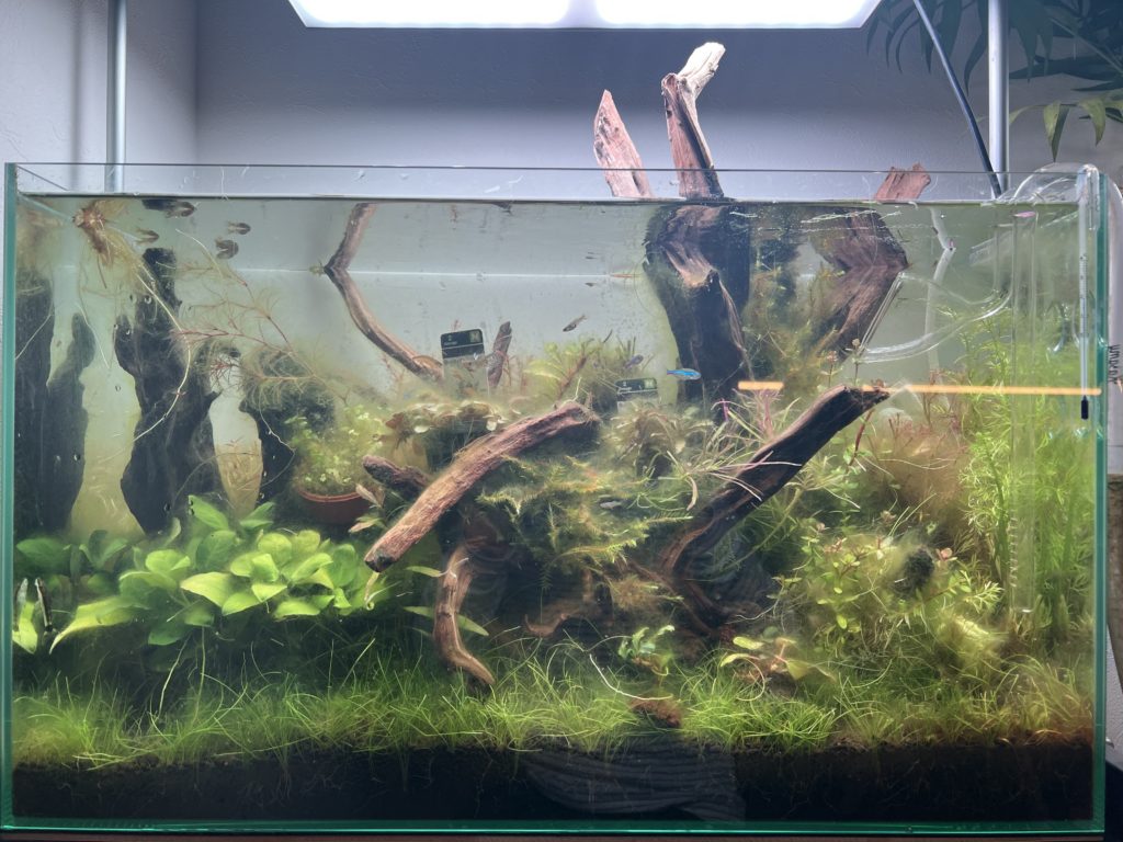 軽くトリミングを行い、手でコケを取っていってます。換水は50%程行いました。