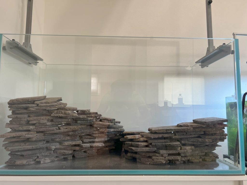 なにせ90×45×50㎝の水槽です。単純に満タンの水を入れるだけで200㎏オーバーで底に台とガラス水槽の重量が加算されます。レイアウト次第では300㎏くらいになると思います。