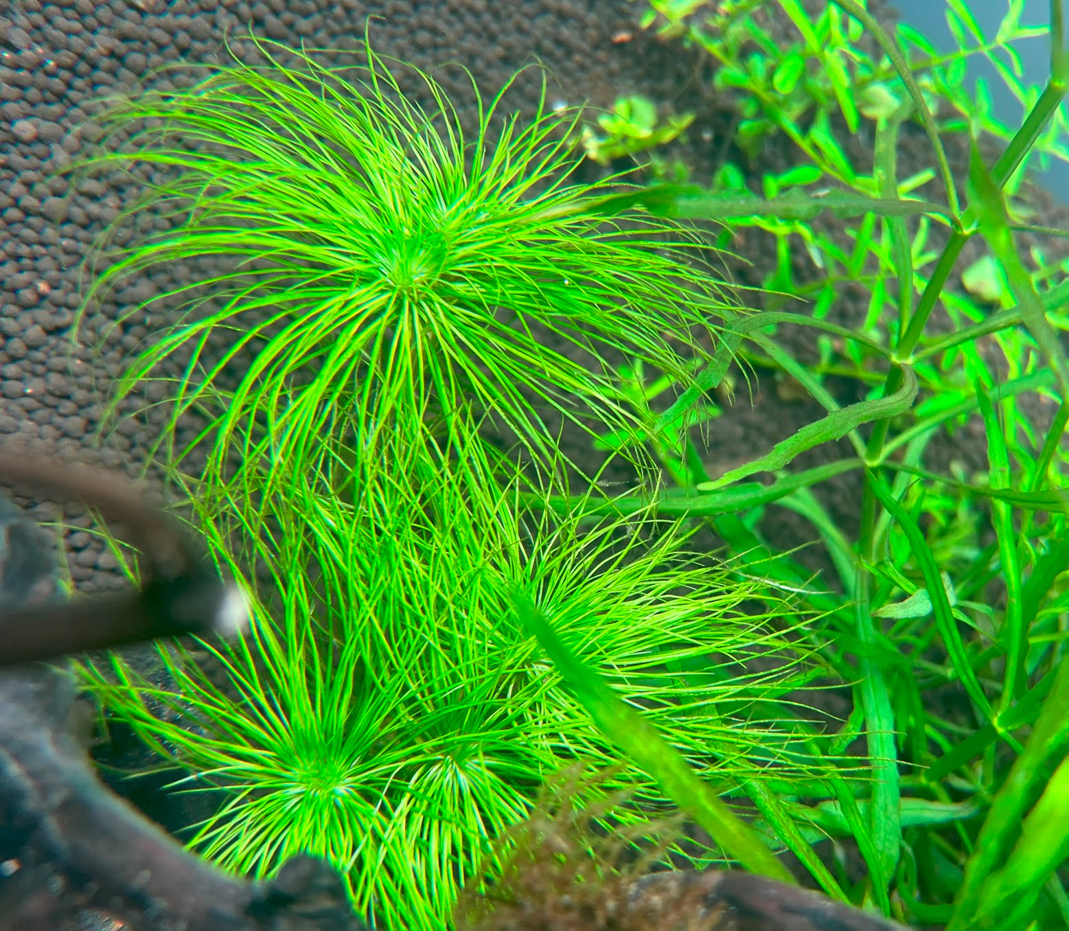 成長速度は割と早く、下葉は枯れやすいです。トリミングを繰り返す度に色が薄くなる場合があります。栄養が不足している可能性が考えられます。水の硬度は低い方がきれいに育つ。硬度が高い場合、細い葉で円形を保ちにくいように感じます。