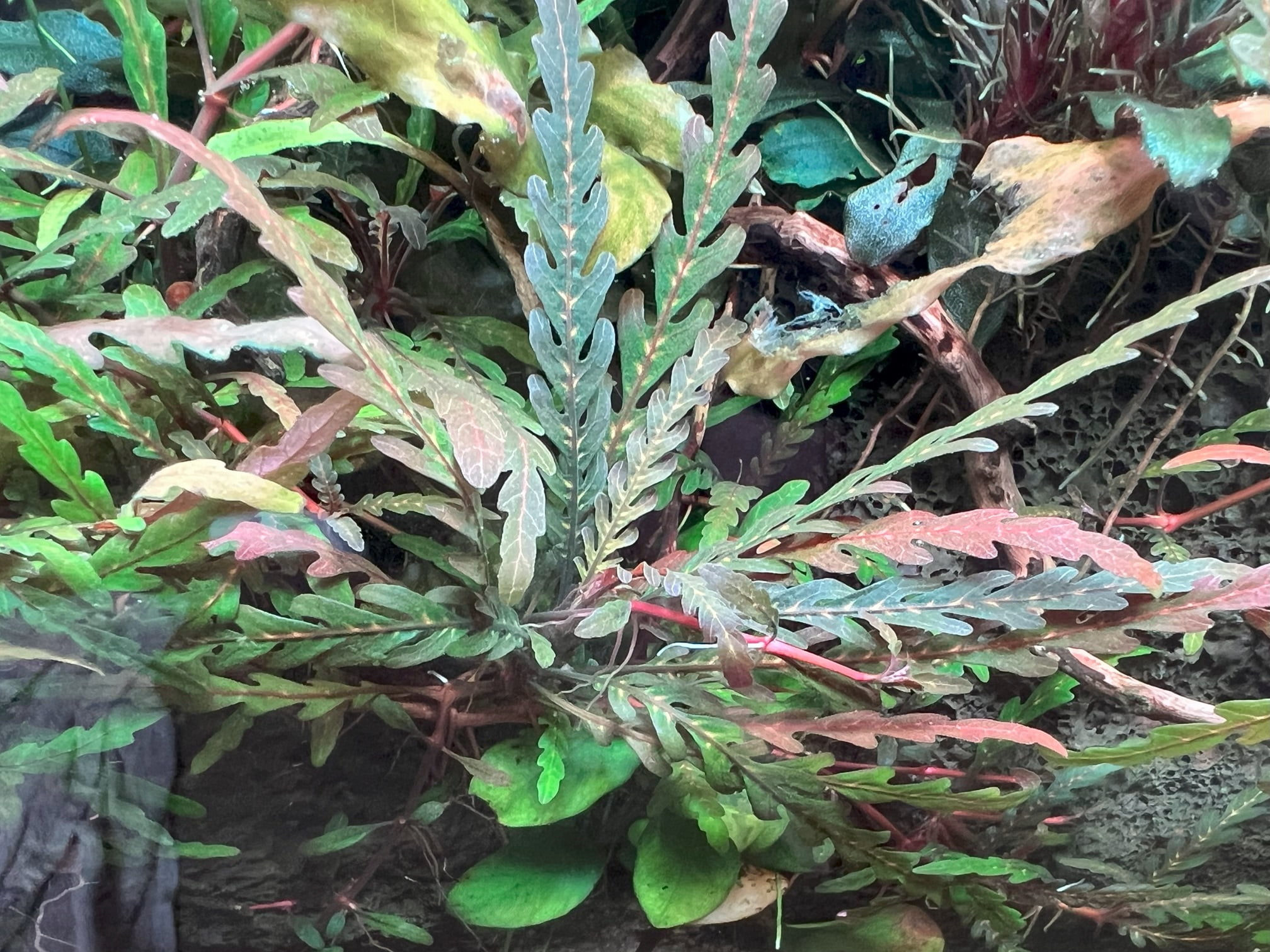 活着し、群生する姿はとても美しいです。赤く育てたい場合、貧栄養か高光量にするとよいですが、貧栄養は他の水草にも影響しますので活着させて高光量にします。ギザギザの葉で石組みレイアウトの隙間を埋めるように活着させると圧巻です。非常に活着力が強く、活着さえすれば岩を接着しなくても保持できる程です。